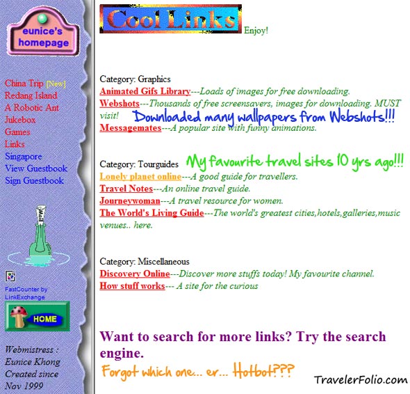 Back in the heydays, when there was no Facebook, no Twitter, no Web 2.0, Geocities was about as close as what we know today as social networks. It offered free web hosting services and that was where I learnt to write HTML to create my homepage and share travel photos online with friends! Back then, blinking gifs, marquee text and MIDI were very popular! Oops! Have I revealed my age? … π