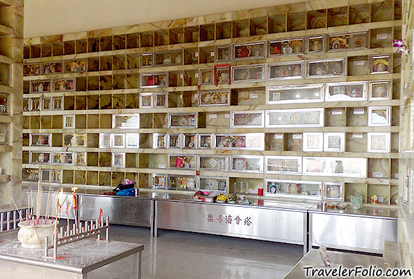 Perched against a hill slope in Air Itam, Kek Lok Si (极乐寺) is the largest Buddhist temple in Southeast Asia. The magnificent temple also houses a columbarium with niches to store cremation urns. Those marble niches at the top floor facing the city and the sea are the most expensive: one niche costs up to RM30,ooo (~US$8700).