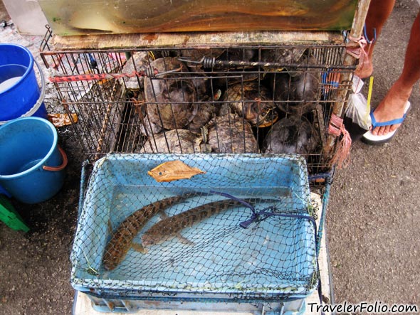 A cage of turtles. apparently, are for someone’s dining table. Hey maybe that’s for “animal liberation”. Also, live fish in buckets of water.
