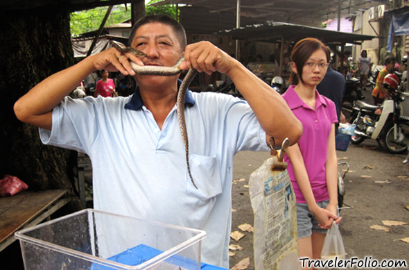 This friendly uncle took out a harmless-looking little snake from the container and posed this shot for me. Well, I guess, those snakes are for consumption. :S Or could it be for “animal liberation”?