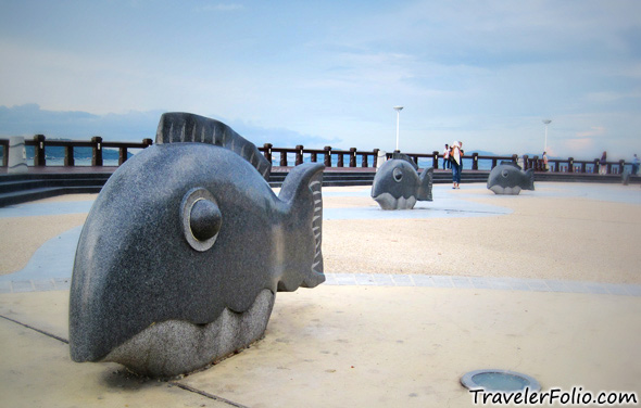 After a fantastic day out snorkeling in Pulau Sapi and Pulau Manukan, we just wandered around the waterfront area, trying to sniff out any surprises along the way. At the roundabout near the Central Market in Jalan Tun Fuad Stephen, a giant marlin seems to have leapt out of South China Sea and stays inland timelessly, with Pulau Gaya in the background.