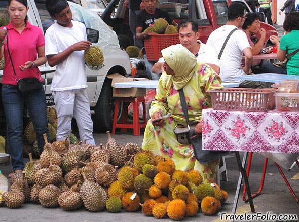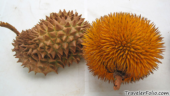 The pictures of durians reminds me of Richard Sterling (famous traveler & food critique). He described durian smell as pig-shit, turpentine and onions, garnished with a gym sock π