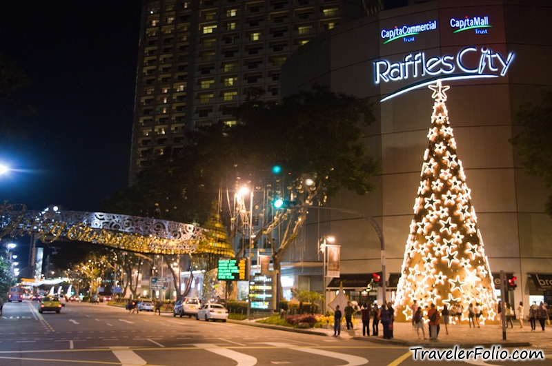 The giant Christmas tree standing at Raffles City.