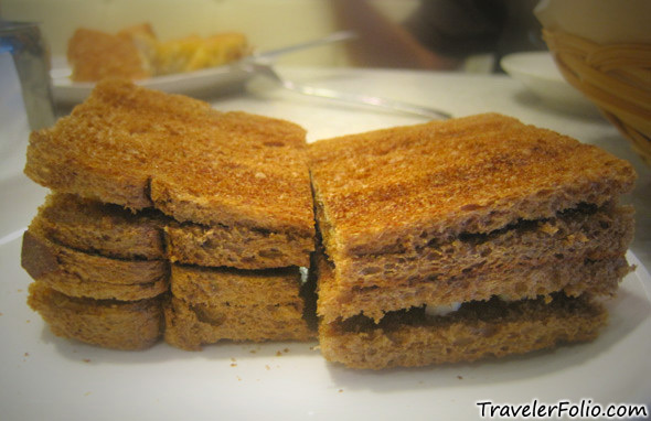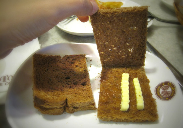 We like to snack at Oldtown Cafe whenever we are in Penang. That day we ordered some slices of kaya butter toast. They looked good on the outside, though seemed abit too dry and crisp. I thought I didn’t taste any butter so I lifted up the top slice…