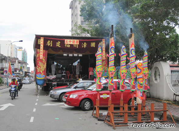 A scene of how the Chinese in Penang worship during the Ghost festival or some non-Chinese prefer to call it the Chinese Halloween. In Singapore now, there are also many altars being set up for worshiping during the seventh lunar month and makeshift stages (in Chinese we called it “ge tai”) for performances. I could hear people singing loudly on some nights from my home and lot of ashes drifting in the air on days when many burn incense papers as offering to the spirits (hungry ghosts!). Read about Hungry Ghost festival in Singapore.